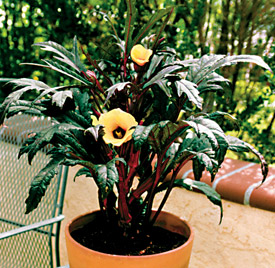 Little Lucy Hybrid is the first-ever Dwarf Red Okra and looks as Great as it Tastes! These gleaming burgundy pods, held abundantly all over neat little 2-foot plants, are almost too pretty to eat! The flowers and the foliage just add to the color show. Little Lucy Hybrid begins its display with 3-inch blooms of yellow and purple, arising very abundantly all over compact plants just 2 feet tall and a foot wide. The fruit follows the blooms -- large, attractive 4- to 4 1/2-inch pods of rich burgundy, which really stand out from the maroon-veined green foliage. This plant is a true edible ornamental!